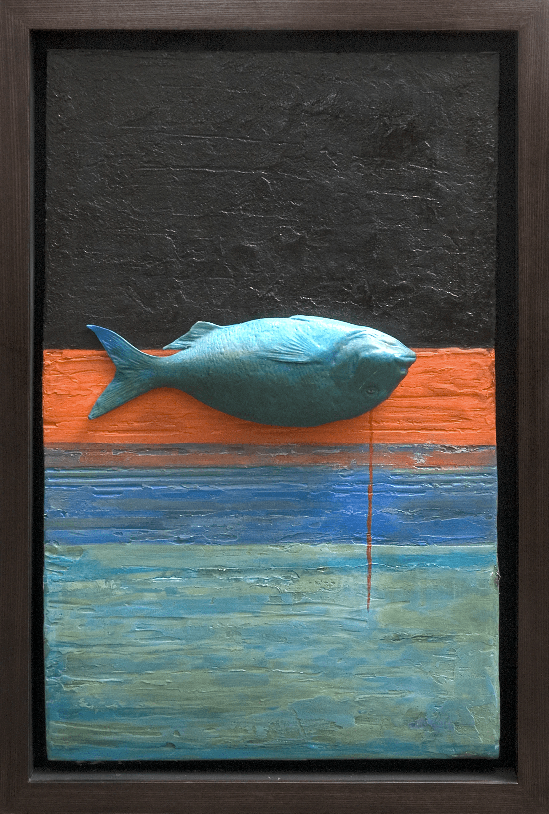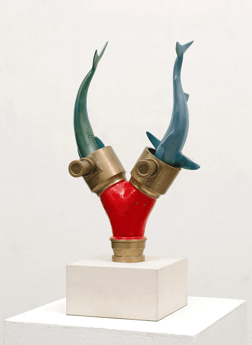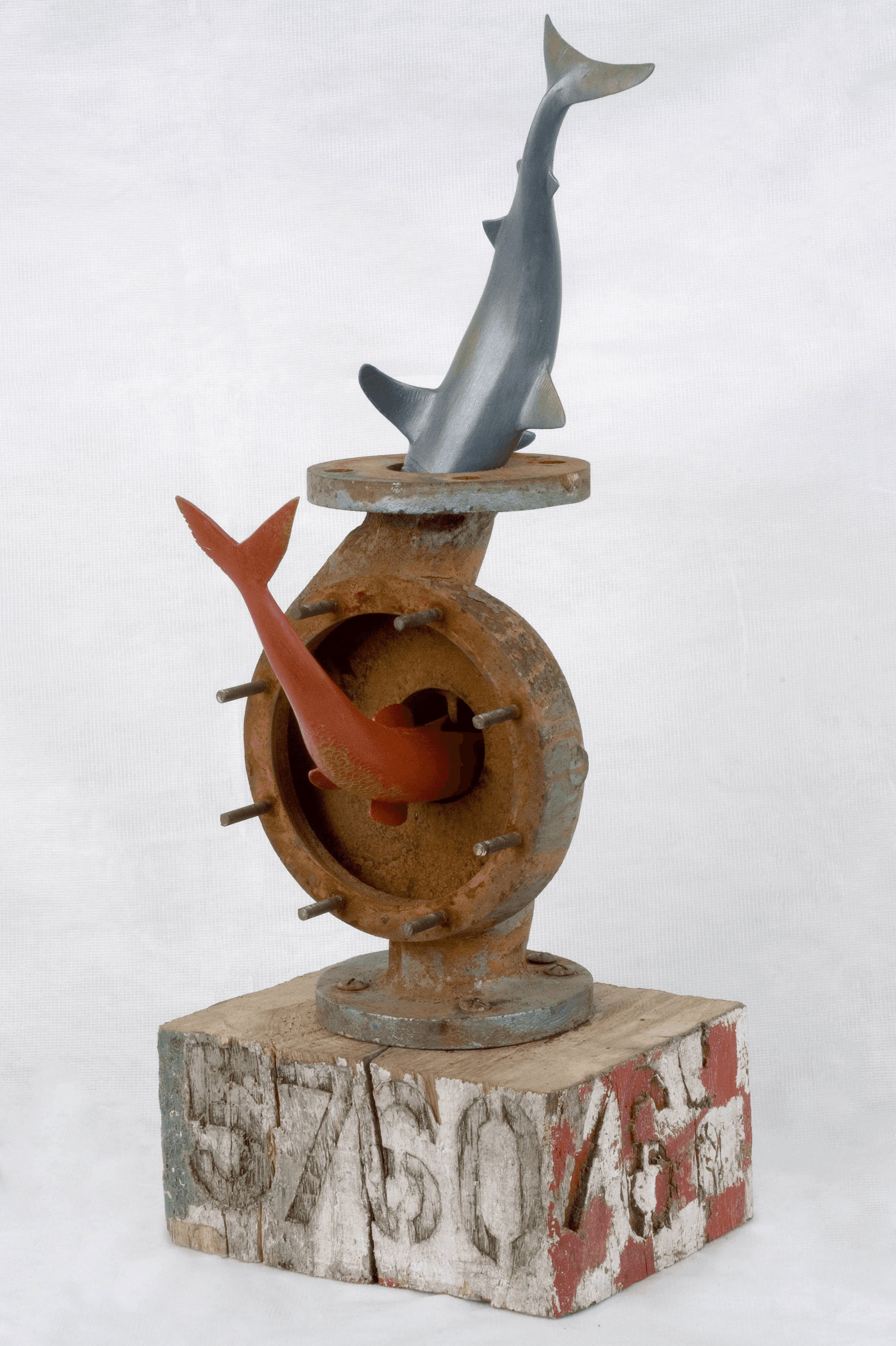 Medium: Metal pipe, wooden base , hand coloured resin fish