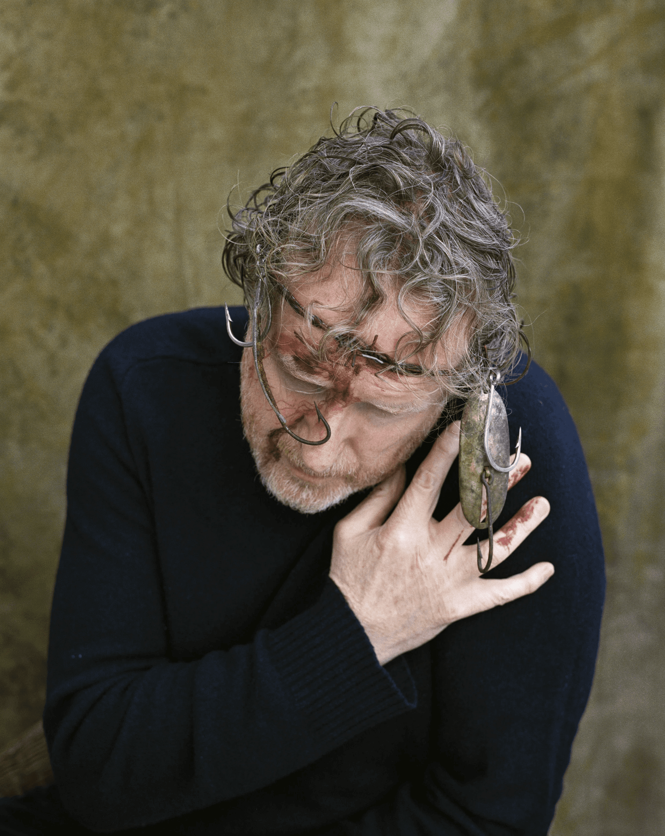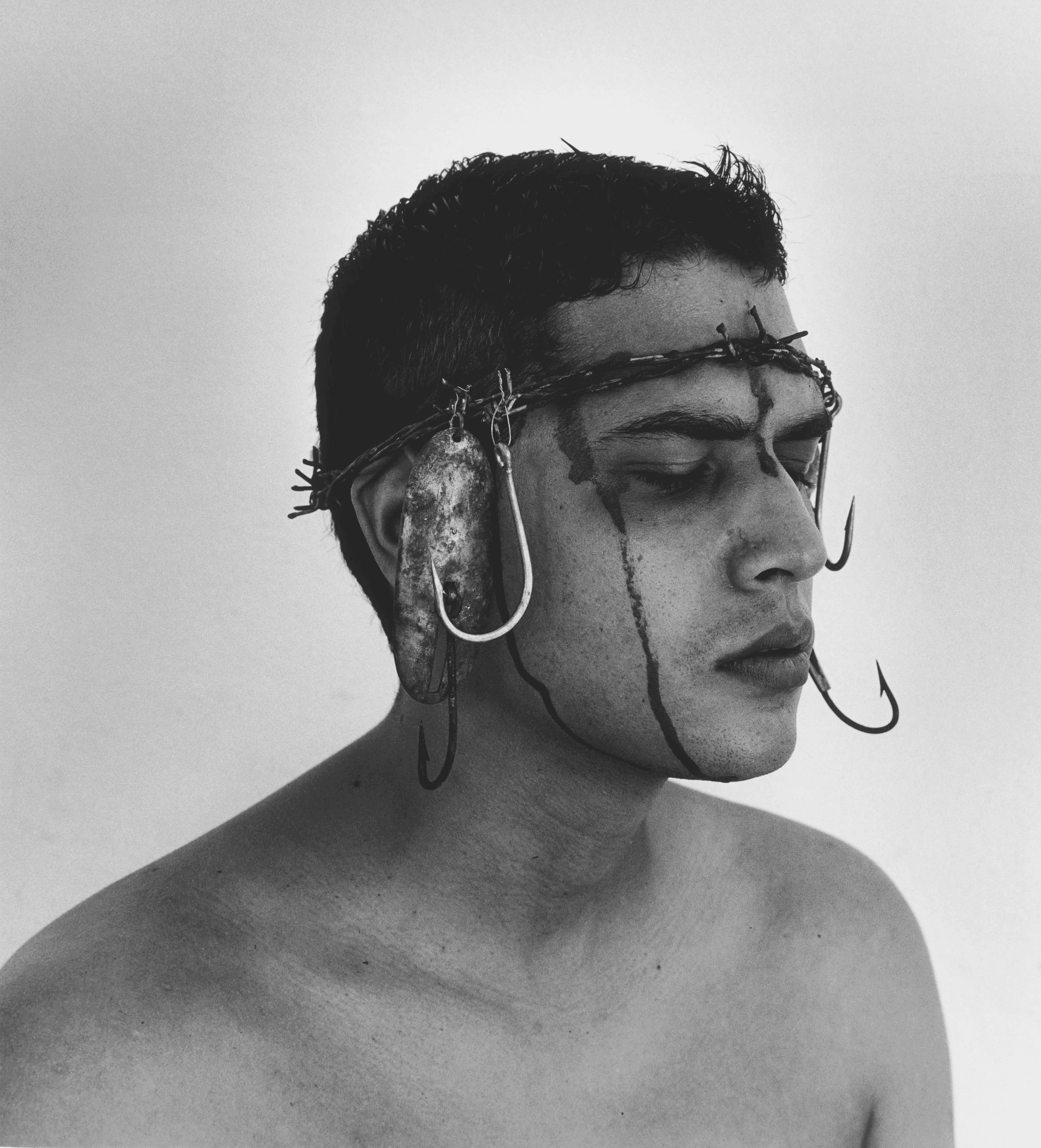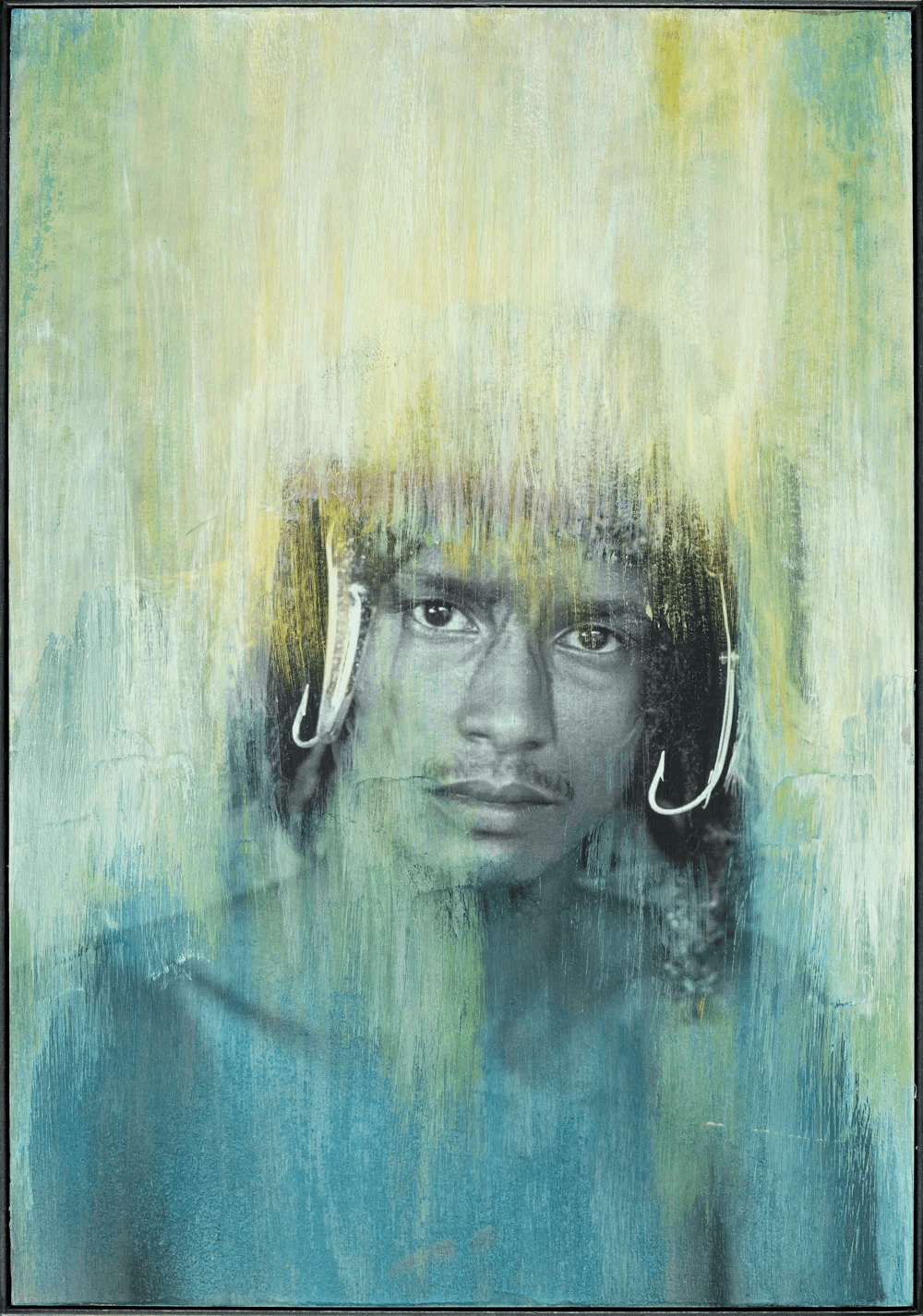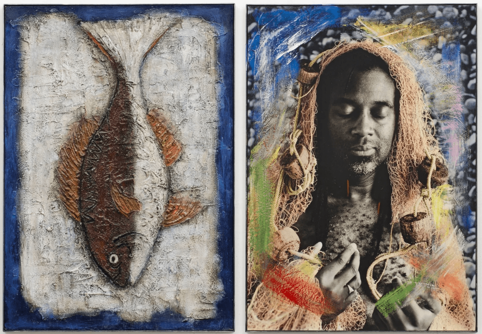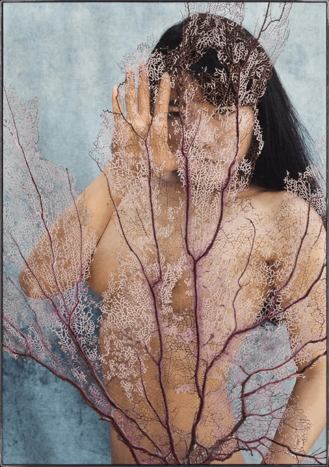 Crown of Hooks is a statement about global overfishing. This ongoing series shows photographs distorted with mixed media, sometimes involving sculptural panels that are exhibited as diptychs.