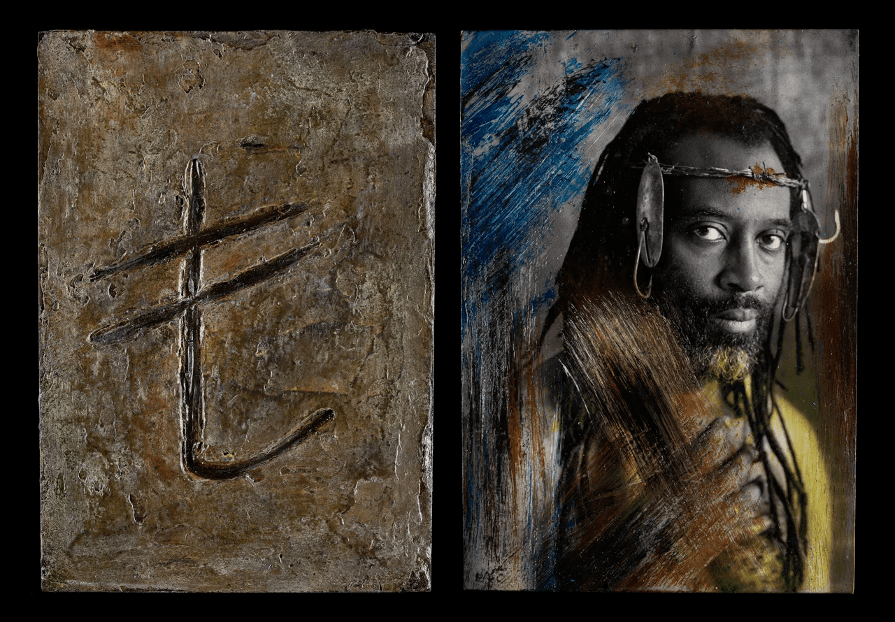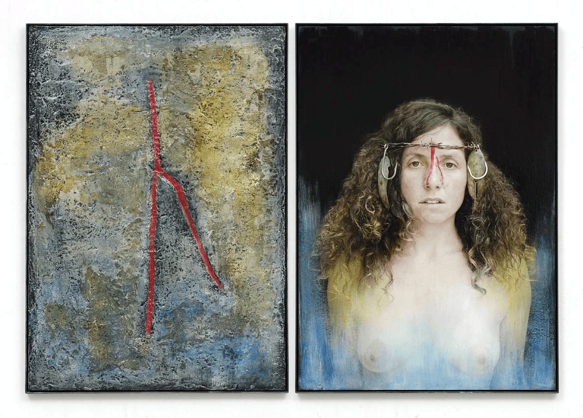 The photographic images are not digitally enhanced - they are worked over directly with mixed media materials, such as wax and oil. The diptychs hang as sculptural panels, carved into tar and resin.