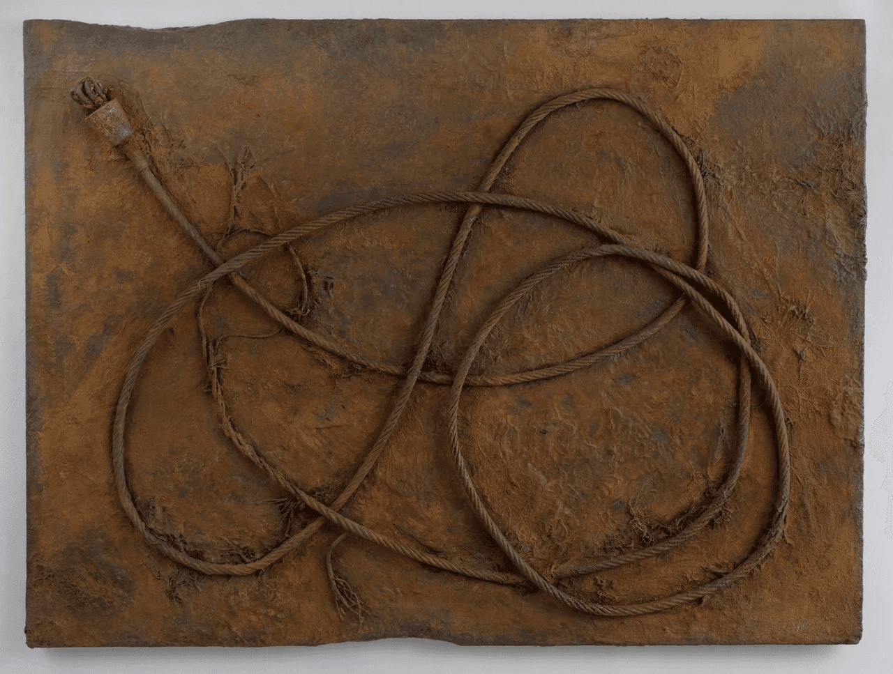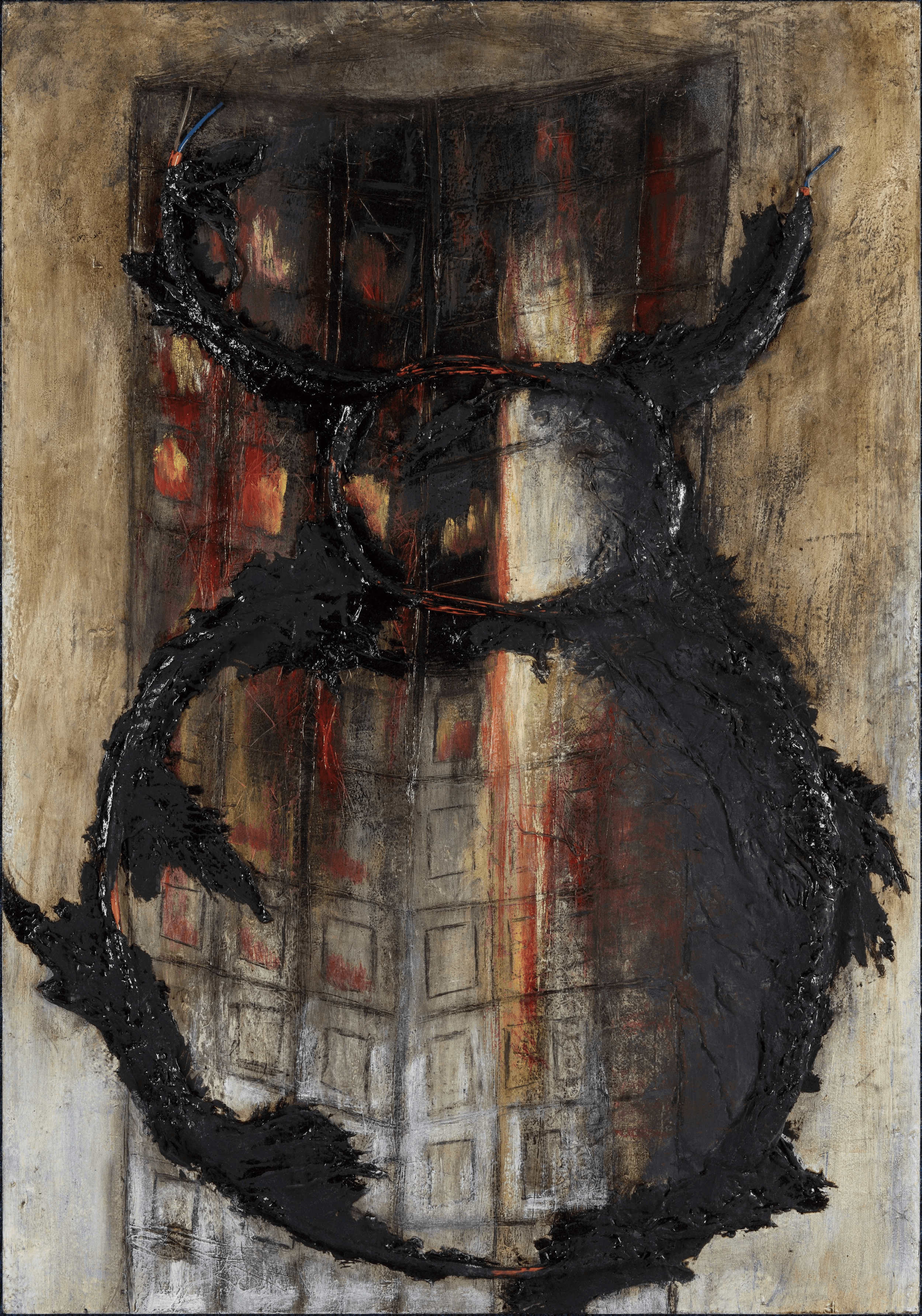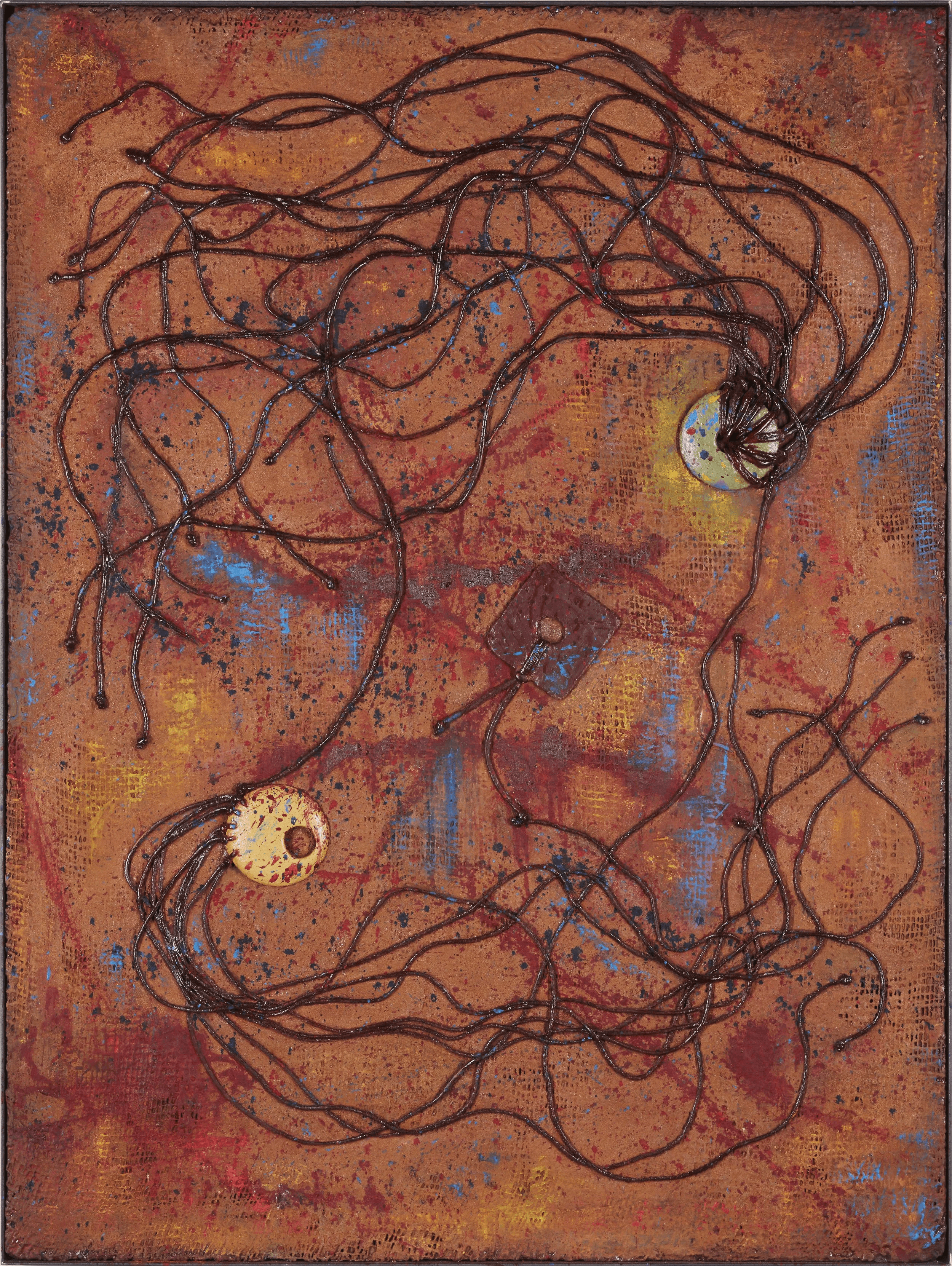 Medium: bitumen tar, plastic, wood, acrylic, resin