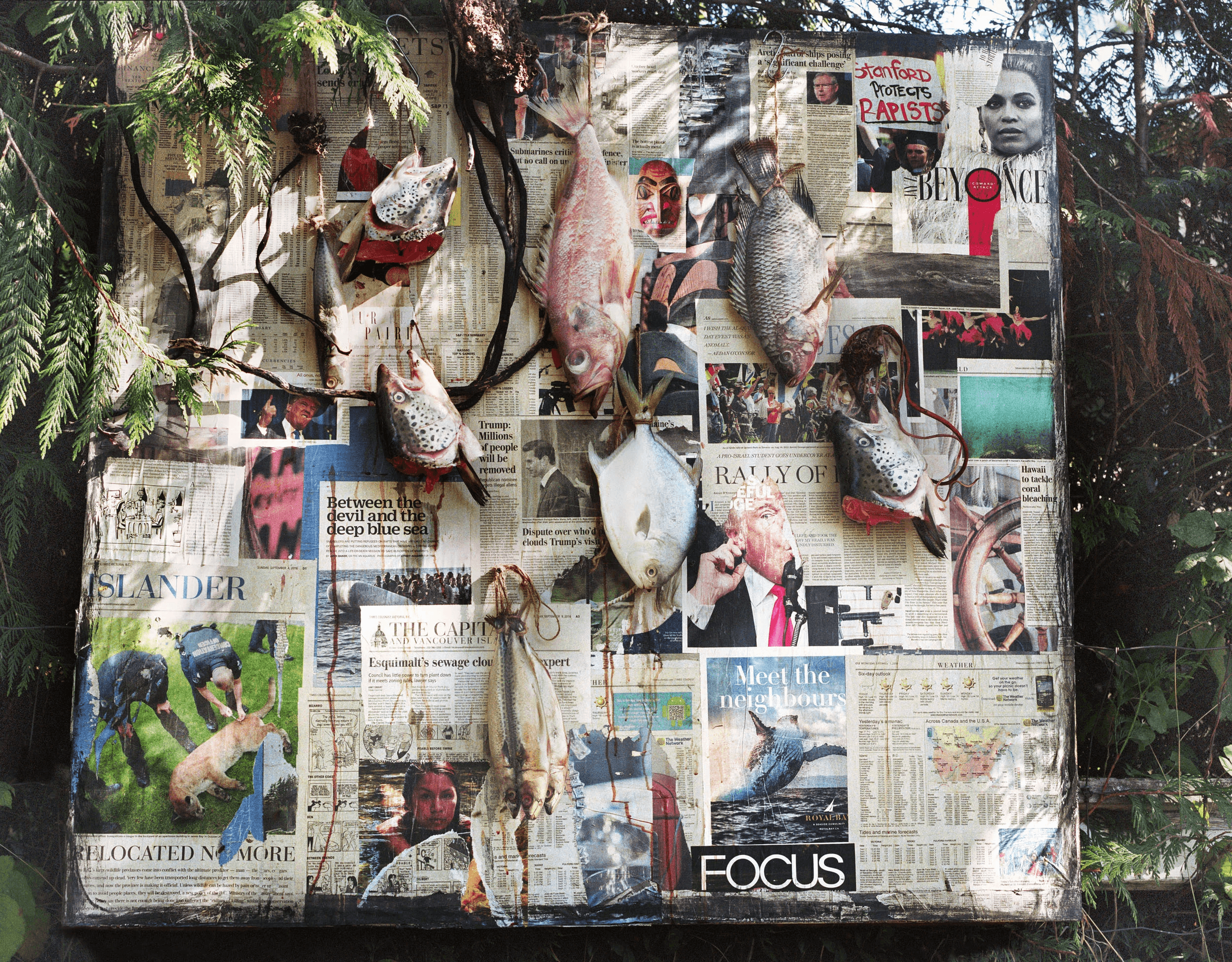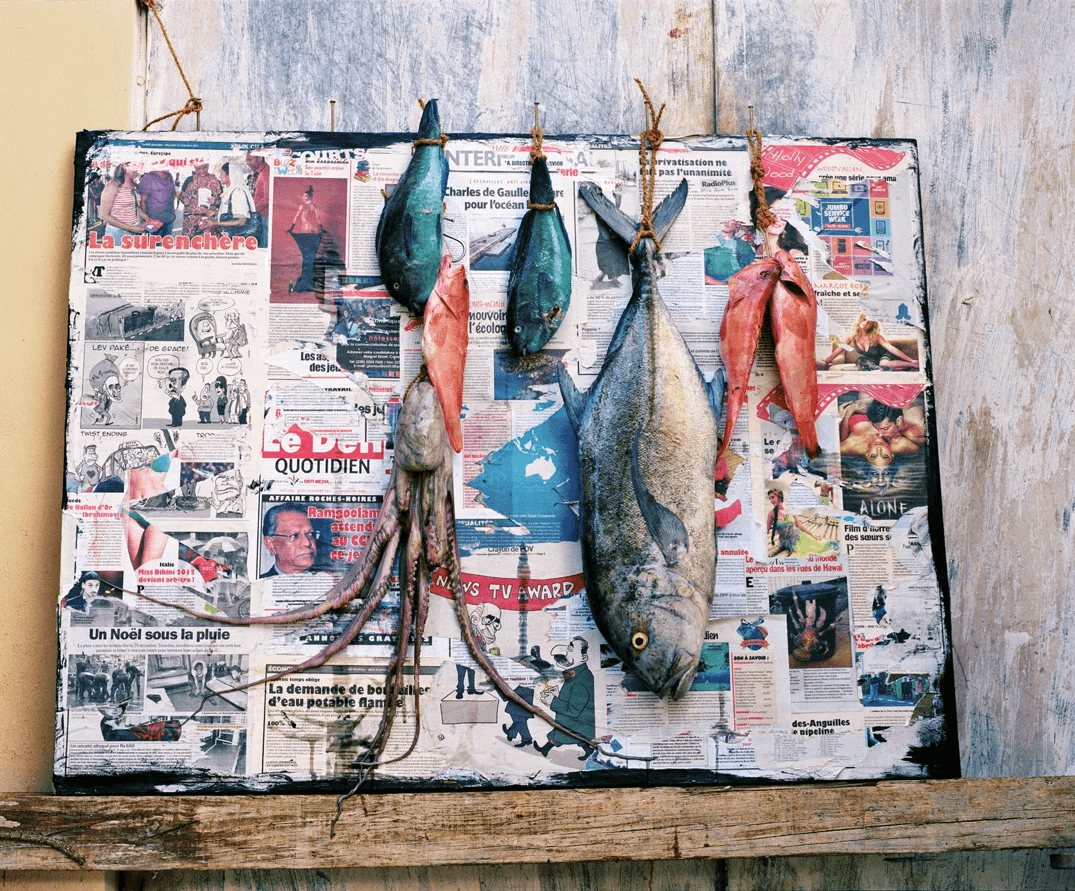 Journal de Mer is an ongoing series, which examines different countries, continents and places that have a deep connection with the sea. Journal de Mer expresses the rapid state of flux in chronicling the journal/diary about the sea. Paradoxically, a human constant is the power of distraction and our eagerness for it – away from the matters that will challenge us to think and do better. Through newspaper collage and hooked seafood imagery, Journal de Mer confronts us with this accusation.